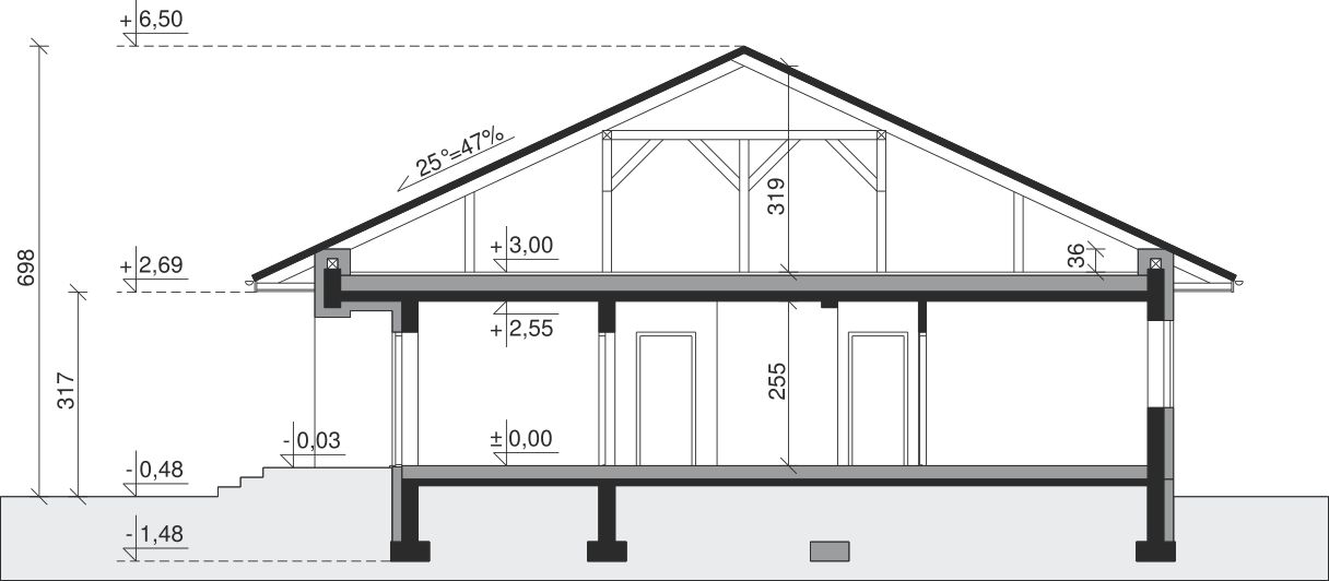 Ściany zewnętrzne: pustak 25 cm, styropian 20 cm. Ściany nośne: pustak 25 cm. Strop: monolityczny żelbetowy. Dach: kąt nachylenia 25°, pokrycie - dachówka ceramiczna lub betonowa. Instalacja solarna.