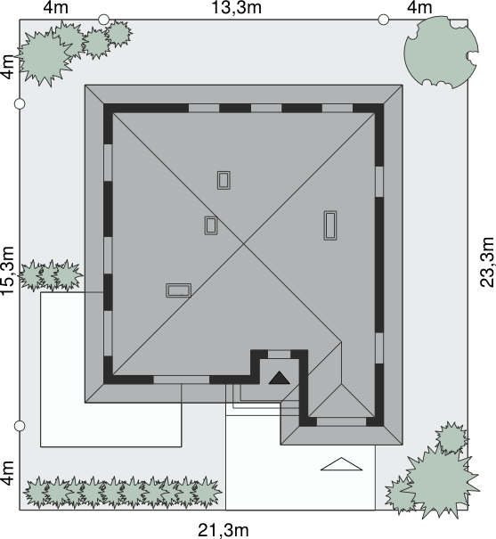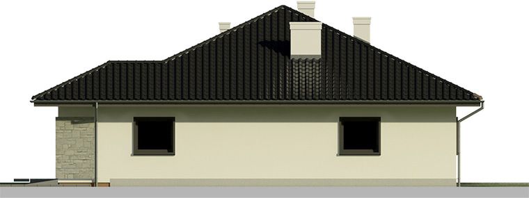 Ściany zewnętrzne: pustak 25 cm, styropian 15 cm. Ściany nośne: pustak 25 cm. Strop: monolityczny żelbetowy. Dach: kąt nachylenia 30°, pokrycie - dachówka ceramiczna lub betonowa.