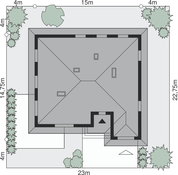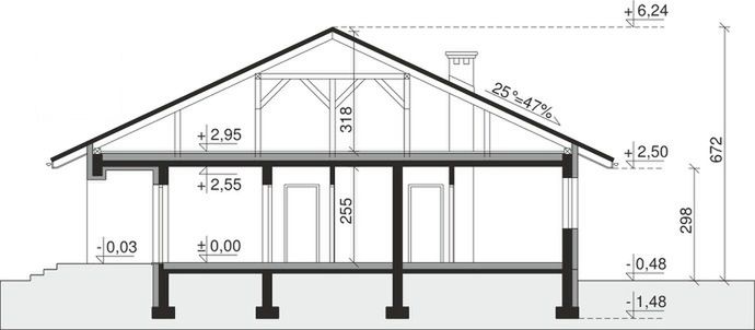 Ściany zewnętrzne: pustak 25 cm, styropian 15 cm. Ściany nośne: pustak 25 cm. Strop: monolityczny żelbetowy. Dach: kąt nachylenia 25°, pokrycie - dachówka ceramiczna lub betonowa.