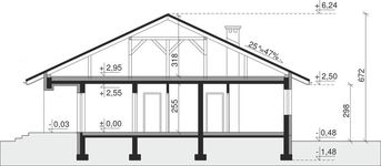Graficzne opracowanie rzutów poglądowych widocznych na karcie projektu zostało wykonane przez Extradom.pl. Prezentowane przez Extradom.pl wizualizacje wykonane zostały przez autora projektu i należy poczytywać je jedynie za przykład i propozycję wykończenia, wizję architektoniczną autora projektu. Ostateczne wykończenie budynku może nastąpić na wiele sposobów. Szczegółowe rozwiązania zastosowane w oferowanej dokumentacji - w tym również ilość, lokalizacje i wygląd okien, drzwi, kominów - mogą w niewielkim stopniu różnić się od prezentowanej wizualizacji budynku.