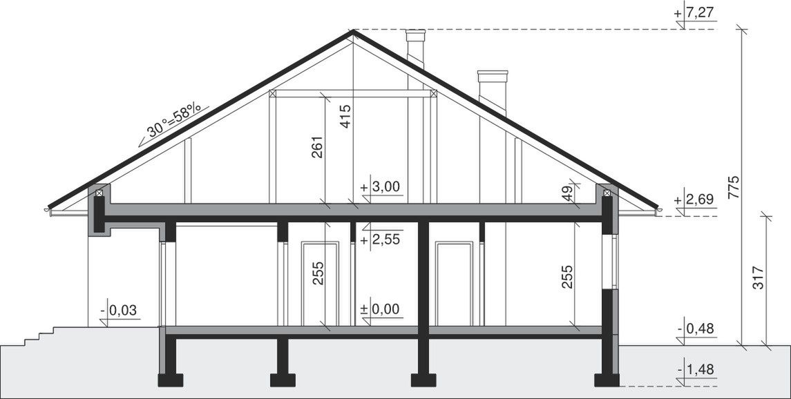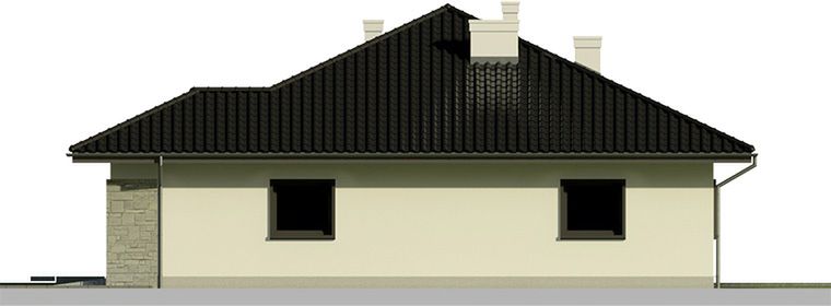 Ściany zewnętrzne: pustak 25 cm, styropian 15 cm. Ściany nośne: pustak 25 cm. Strop: monolityczny żelbetowy. Dach: kąt nachylenia 30°, pokrycie - dachówka ceramiczna lub betonowa.