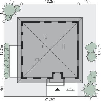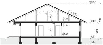 Ściany zewnętrzne: pustak 25 cm, styropian 15 cm. Ściany nośne: pustak 25 cm. Strop: monolityczny żelbetowy. Dach: kąt nachylenia 25°, pokrycie - dachówka ceramiczna lub betonowa.