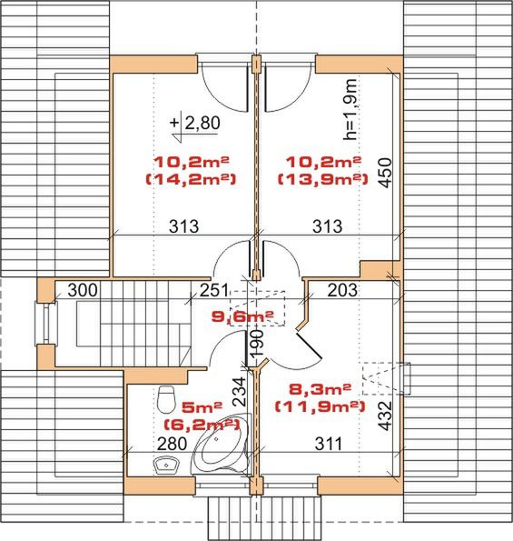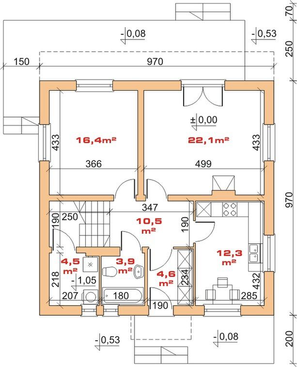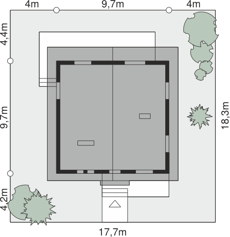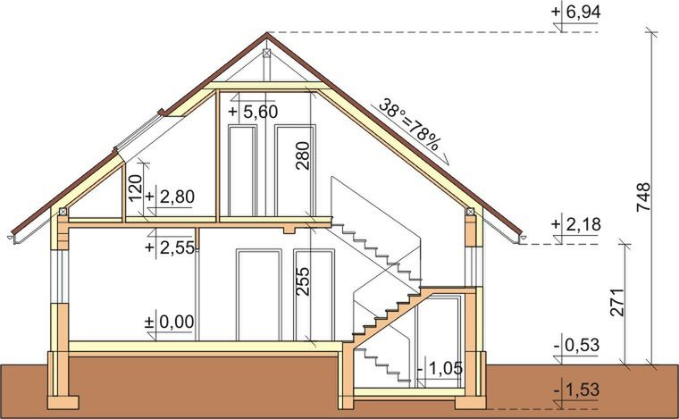 Ściany zewnętrzne: pustak 25 cm, styropian 15 cm. Ściany nośne: pustak 25 cm. Strop: monolityczny żelbetowy. Dach: kąt nachylenia 38°, pokrycie - dachówka ceramiczna lub betonowa.