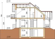 Ściany zewnętrzne: pustak 29 cm, styropian 15 cm. Ściany nośne: pustak 19 i 29 cm. Strop: monolityczny żelbetowy. Dach: kąt nachylenia 38°, pokrycie - dachówka ceramiczna lub betonowa.