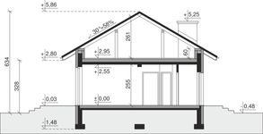 Ściany zewnętrzne: pustak 25 cm, styropian 20 cm. Ściany nośne: pustak 25 cm. Strop: monolityczny żelbetowy. Dach: kąt nachylenia 30°, pokrycie - dachówka ceramiczna lub betonowa. Instalacja solarna.
