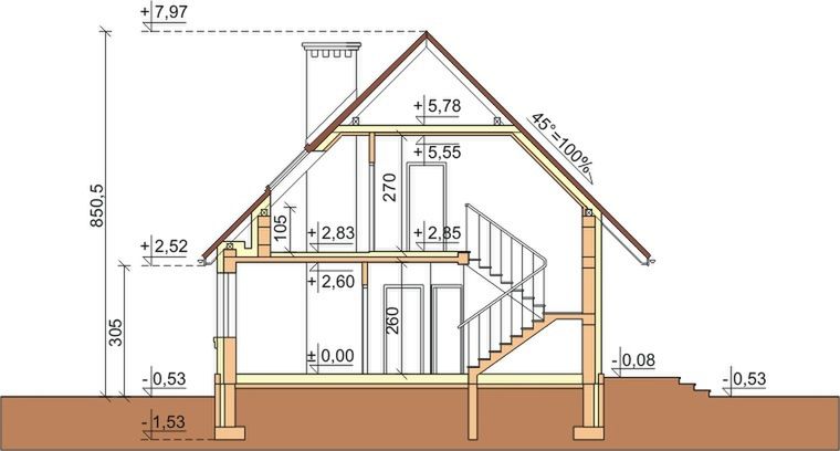 Ściany: pustak ceramiczny 29 cm, styropian 15 cm. Ściany nośne: pustak ceramiczny 19 cm. Strop: monolityczny żelbetowy. Pokrycie dachu: dachówka.
