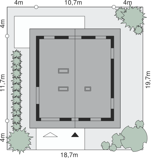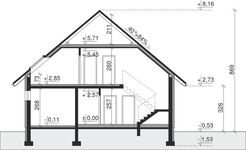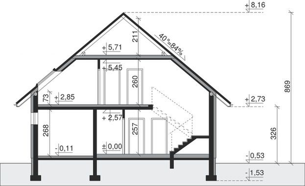 Ściany zewnętrzne: pustak 25 cm, styropian 15 cm. Ściany nośne: pustak 19 cm. Strop: monolityczny żelbetowy. Dach: kąt nachylenia 40°, pokrycie - blacha.