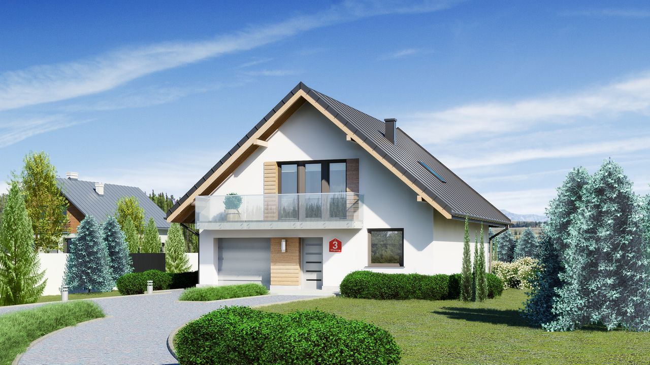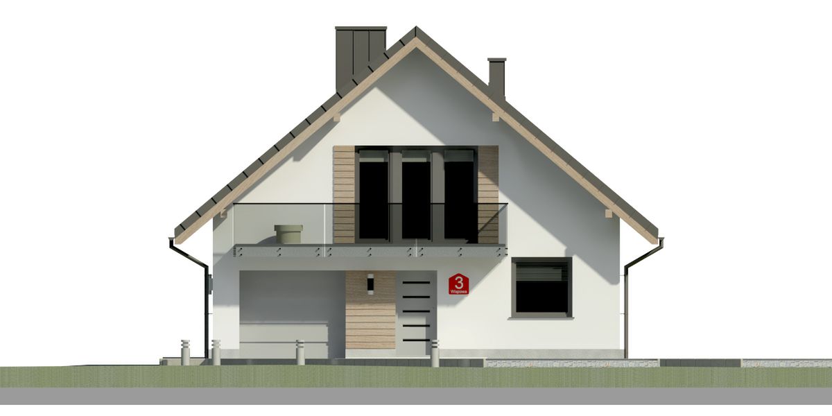 Graficzne opracowanie rzutów poglądowych widocznych na karcie projektu zostało wykonane przez Extradom.pl. Prezentowane przez Extradom.pl wizualizacje wykonane zostały przez autora projektu i należy poczytywać je jedynie za przykład i propozycję wykończenia, wizję architektoniczną autora projektu. Ostateczne wykończenie budynku może nastąpić na wiele sposobów. Szczegółowe rozwiązania zastosowane w oferowanej dokumentacji - w tym również ilość, lokalizacje i wygląd okien, drzwi, kominów - mogą w niewielkim stopniu różnić się od prezentowanej wizualizacji budynku.
