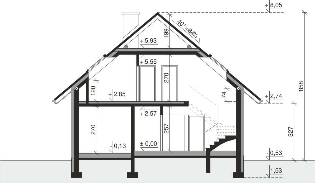 Ściany zewnętrzne: pustak 25 cm, styropian 20 cm. Ściany nośne: pustak 19 cm. Strop: monolityczny żelbetowy. Dach: kąt nachylenia 40°, pokrycie - dachówka ceramiczna lub betonowa. Instalacja solarna.