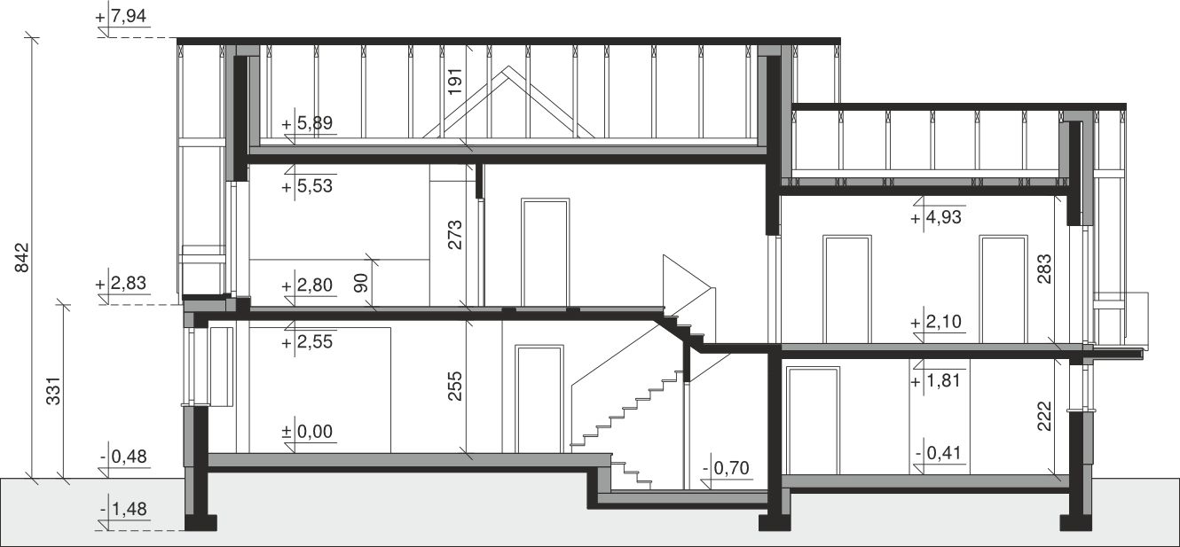 Ściany zewnętrzne: pustak 25 cm, styropian 20 cm. Ściany nośne: pustak 25 cm. Strop: monolityczny żelbetowy. Dach: kąt nachylenia 40°, pokrycie - dachówka ceramiczna lub betonowa.