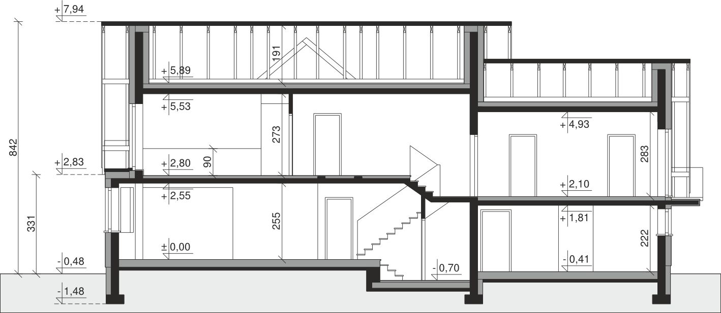 Ściany zewnętrzne: pustak 25 cm, styropian 20 cm. Ściany nośne: pustak 25 cm. Strop: monolityczny żelbetowy. Dach: kąt nachylenia 40°, pokrycie - dachówka ceramiczna lub betonowa.
