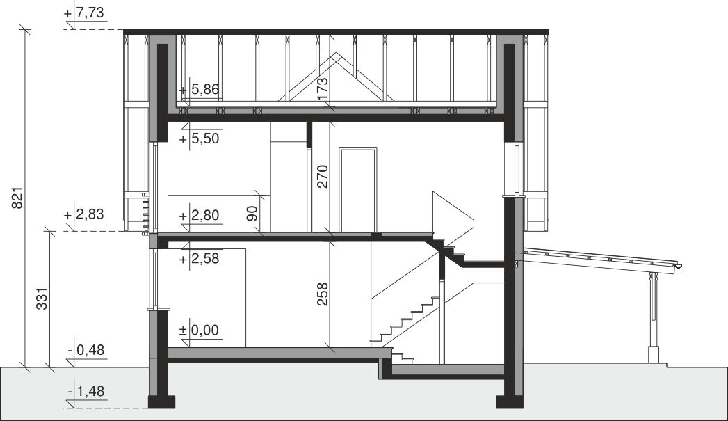 Ściany zewnętrzne: pustak 25 cm, styropian 20 cm. Ściany nośne: pustak 25 cm. Strop: monolityczny żelbetowy. Dach: kąt nachylenia 40°, pokrycie - dachówka ceramiczna lub betonowa. Instalacja solarna.