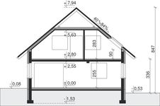 Ściany zewnętrzne: pustak 25 cm, styropian 20 cm. Ściany nośne: pustak 25 cm. Strop: monolityczny żelbetowy. Dach: kąt nachylenia 40°, pokrycie - dachówka ceramiczna lub betonowa.