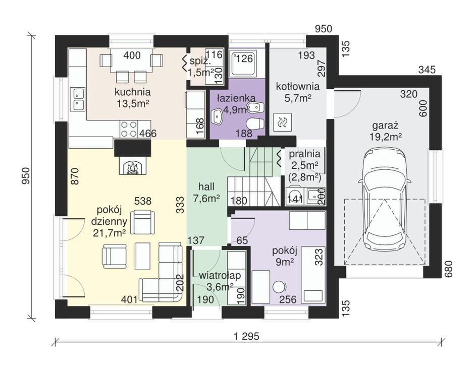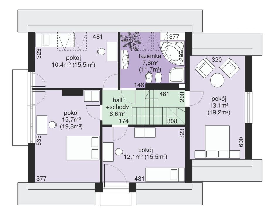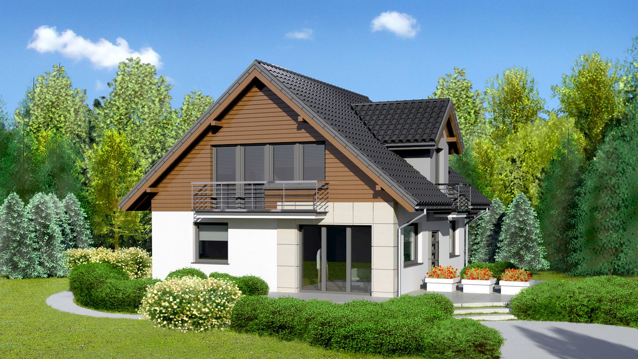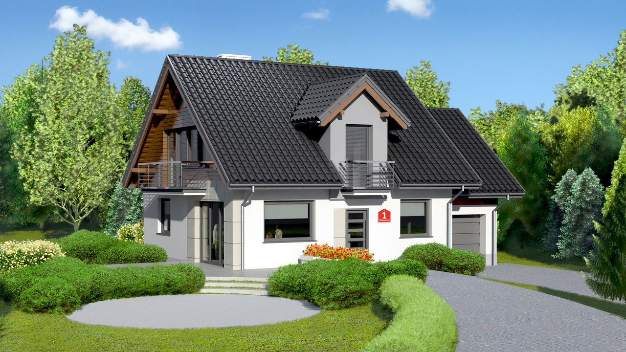 Graficzne opracowanie rzutów poglądowych widocznych na karcie projektu zostało wykonane przez Extradom.pl. Prezentowane przez Extradom.pl wizualizacje wykonane zostały przez autora projektu i należy poczytywać je jedynie za przykład i propozycję wykończenia, wizję architektoniczną autora projektu. Ostateczne wykończenie budynku może nastąpić na wiele sposobów. Szczegółowe rozwiązania zastosowane w oferowanej dokumentacji - w tym również ilość, lokalizacje i wygląd okien, drzwi, kominów - mogą w niewielkim stopniu różnić się od prezentowanej wizualizacji budynku.