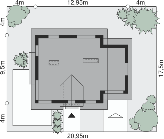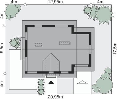 Ściany zewnętrzne: pustak 25 cm, styropian 15 cm. Ściany nośne: pustak 25 cm. Strop: monolityczny żelbetowy. Dach: kąt nachylenia 40°, pokrycie - dachówka ceramiczna lub betonowa.