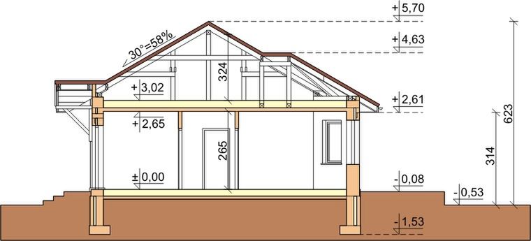 Ściany: pustak ceramiczny 44 cm. Ściany nośne: pustak ceramiczny 25 cm. Strop: monolityczny żelbetowy. Pokrycie dachu: dachówka ceramiczna lub betonowa.