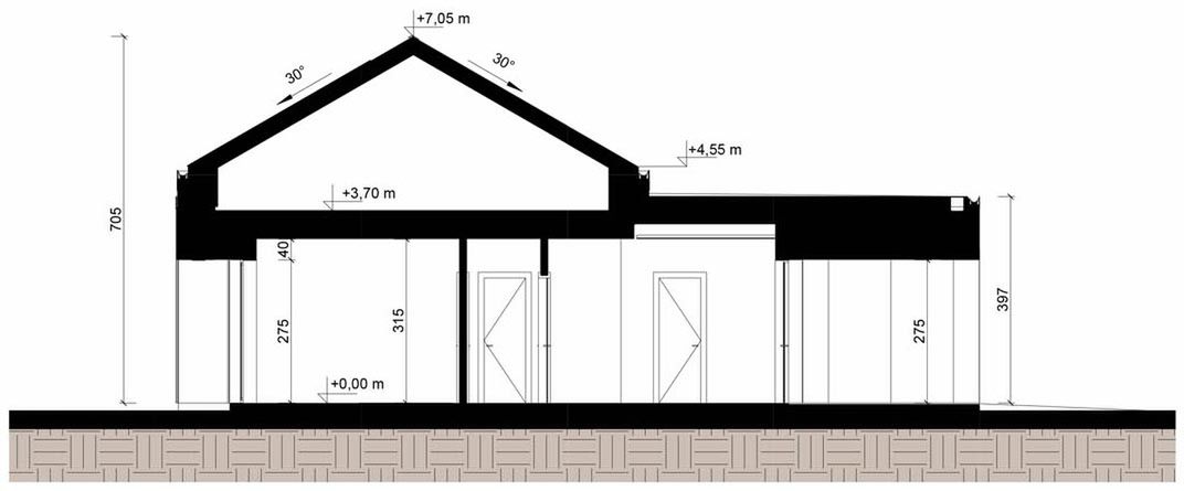 Posadowienie: ławy fundamentowe. Ściany zewnętrzne: bloczki silikatowe 24cm, Styropian 25 cm / wełna mineralna 20 cm, tynk elewacyjny / drewno elewacyjne Strop i stropodach): monolityczny żelbetowy, pokrycie papa Konstrukcja dachu: drewniana więźba dachowa krokwiowo – jętkowa Pokrycie dachu: blacha na rąbek stojący