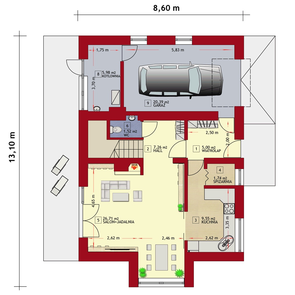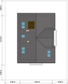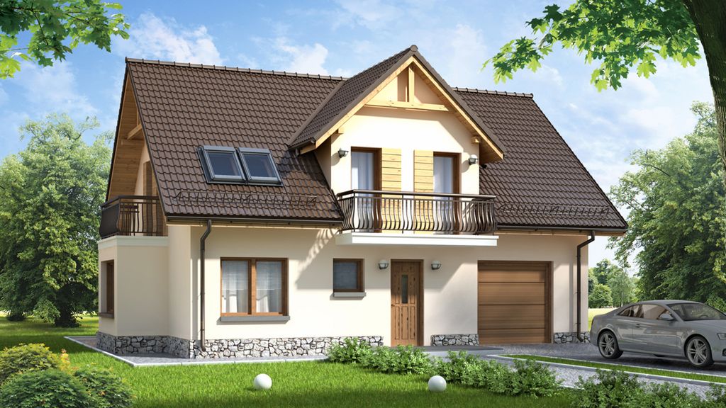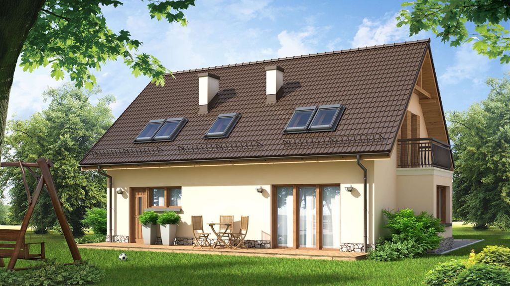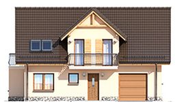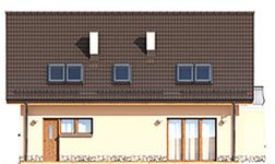 Graficzne opracowanie rzutów poglądowych widocznych na karcie projektu zostało wykonane przez Extradom.pl. Prezentowane przez Extradom.pl wizualizacje wykonane zostały przez autora projektu i należy poczytywać je jedynie za przykład i propozycję wykończenia, wizję architektoniczną autora projektu. Ostateczne wykończenie budynku może nastąpić na wiele sposobów. Szczegółowe rozwiązania zastosowane w oferowanej dokumentacji - w tym również ilość, lokalizacje i wygląd okien, drzwi, kominów - mogą w niewielkim stopniu różnić się od prezentowanej wizualizacji budynku.