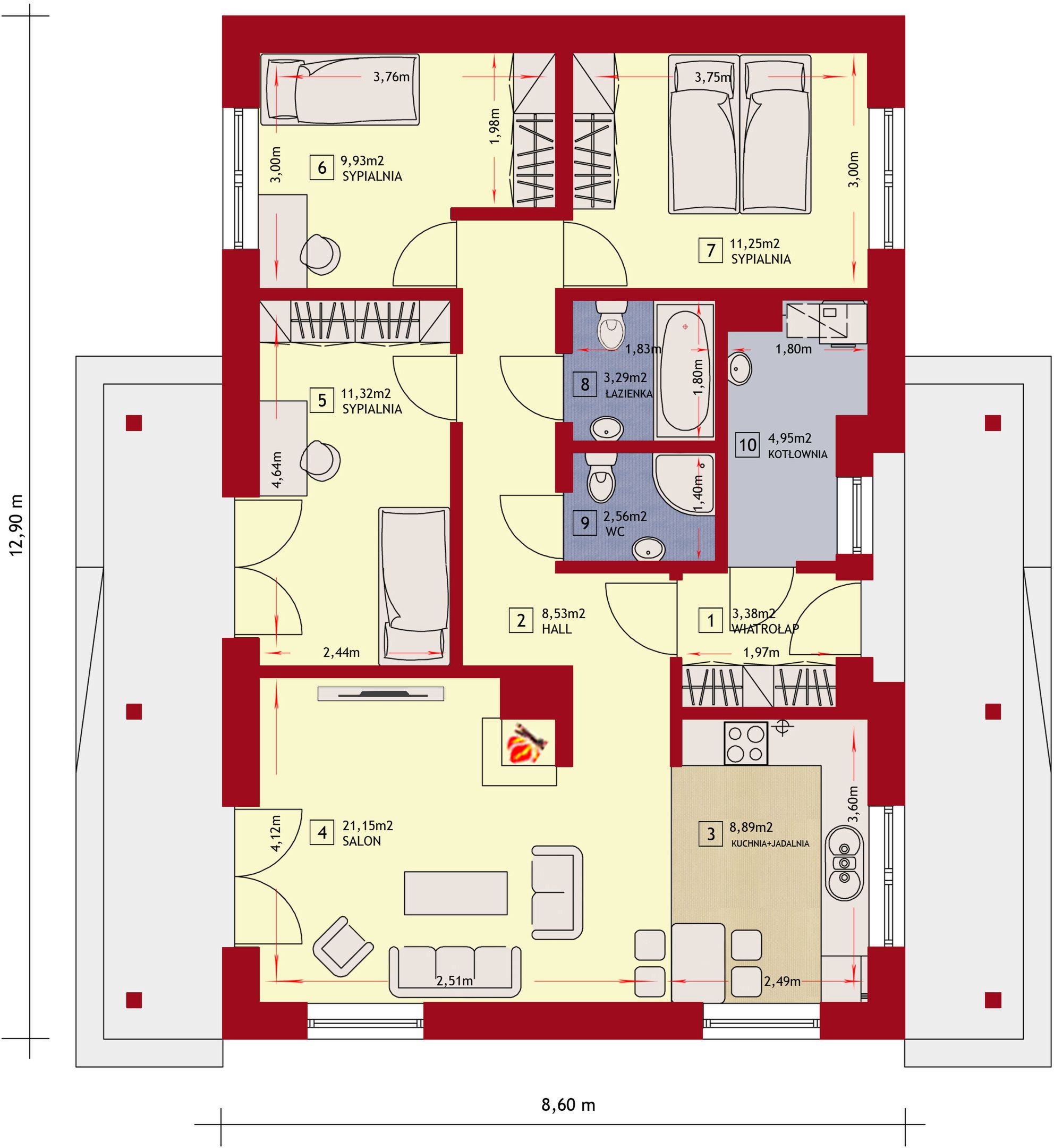 Przy wyborze odpowiedniego projektu największe znaczenie miało dla nas to, aby wszystkie pomieszczenia znajdowały się na jednej kondygnacji, a jednocześnie interesowała nas możliwość zaadaptowania poddasza, jeśli w przyszłości zaszłaby taka potrzeba. Sprawą priorytetową był także metraż - od początku zależało nam na niedużym domu o powierzchni do 100 m². Oglądnęliśmy wiele różnych propozycji, a ostatecznie zdecydowaliśmy się na realizację projektu Dom w Luizjanie Mini KRN1039. Opowiadał on powyższym wymaganiom, a rozwiązaniem które bardzo przypadło nam do gustu jest w całości zadaszony front chroniący wejście przed opadami atmosferycznymi.Rozpoczęcie budowy nieco się przeciągnęło, ponieważ musieliśmy zaadaptować projekt do naszych indywidualnych potrzeb, a znalezienie odpowiedniej firmy nie należało do łatwych zadań. Fachowcy bardzo się cenili, a proponowane przez nich koszty realizacji nie były adekwatne do takiego budynku. Na szczęście udało nam się znaleźć specjalistów, którzy złożyli nam korzystną ofertę cenową i bardzo sprawnie poradzili sobie z powierzonymi pracami. Budowę rozpoczęliśmy w kwietniu 2015 r., a już w sierpniu tego samego roku dom był postawiony i mogliśmy zacząć go wykańczać.Ściany wymurowaliśmy z ceramicznych pustaków, strop tworzy drewniana konstrukcja, a dach pokryliśmy blachodachówką. Przy zastosowaniu powyższych materiałów oraz dzięki korzystnym stawkom za robociznę, udało nam się zamknąć inwestycję w bardzo rozsądnych kosztach. Poprawienie gruntu na działce, postawienie domu w stanie deweloperskim (z wylewkami, wszelkimi instalacjami i futrynami) z elewacją, wykonanie dwóch szamb oraz przydomowej oczyszczalni ścieków, postawienie dwóch wolnostojących garaży o łącznej pow. 60 m² oraz wykonanie prowadzącego do nich podjazdu, zrobienie ogrodzenia 20 arowej działki oraz tarasu z kostki wyniosło łącznie 260 tys. zł.Bryłę z zewnątrz ociepliliśmy 20 cm warstwą styropianu, a dom i wodę użytkową ogrzewamy za pomocą pieca na paliwo stałe. W pierwszym roku od zamieszkania mury musiały się wygrzać i dobrze wyschnąć, dlatego też w kotle paliłem bardzo intensywnie i często wietrzyłem całe mieszkanie. W tamtym okresie przez cały sezon grzewczy zużyliśmy 7,5 m³ drewna i 900 kg węgla. Zeszły okres grzewczy był już korzystniejszy - od września do kwietnia spaliliśmy zaledwie 5 m³ drewna i 300 kg węgla.Z racji zastosowanego sposobu ogrzewania oryginalna kotłownia przy wejściu nie wydała mi się trafionym pomysłem. Nie chciałem wnosić opału i wynosić popiołu przez wiatrołap, dlatego postanowiłem powiększyć bryłę domu od strony bocznej ściany przy sypialniach, robiąc tym samym dobudówkę. Przeznaczyłem ją na zrobienie sporych rozmiarów kotłowni, w której oprócz pieca znajdują się m.in . zbiornik na wodę oraz instalacja przyłączy solarów. Zrobiłem w niej bezpośrednie wyjście na zewnątrz a także wejście od strony części mieszkalnej. W tym celu kosztem części powierzchni jednej z sypialni wykonałem korytarz o szer. 60 cm, a wejście do tego pokoju znajduje się obecnie „po skosie”. Oprócz tego powiększyliśmy taras i jednocześnie wydłużyliśmy jego zadaszenie. Nie wstawiałem drzwi między hallem a wiatrołapem, dzięki czemu tworzą one otwartą przestrzeń. Na chwilę obecną zdecydowałbym się również na lekkie zmniejszenie kuchni na rzecz powiększenia wiatrołapu. Niestety w naszym przypadku było na to za późno, ale szczerze polecam to rozwiązanie innym inwestorom projektu domu Dom w Luizjanie Mini KRN1039.W nowym domu na stałe mieszkamy w trzy osoby i metraż jest dla nas w zupełności wystarczający. Jeden pokój jest wolny, ale często odwiedzają nas i nocują goście: córka z wnuczką, teściowa lub moja mama. Nawet podczas odwiedzin wszyscy czujemy się wygodnie, więc sądzę, że dom zrealizowany według projektu Dom w Luizjanie Mini KRN1039 będzie odpowiedni również dla 5-osobowej rodziny. Jeśli ktoś chciałby uzyskać więcej miejsca, zawsze można zaadaptować poddasze na użytkowe. Warto jednak pomyśleć o tym już wcześniej. Na etapie adaptacji można wtedy przesunąć nieco kominek rezygnując tym samym z łamanego korytarza w kształcie litery „L”. Połączenie hallu i salonu stworzy wtedy dodatkową przestrzeń, idealną do usytuowania wygodnych schodów. Pozdrawiam.