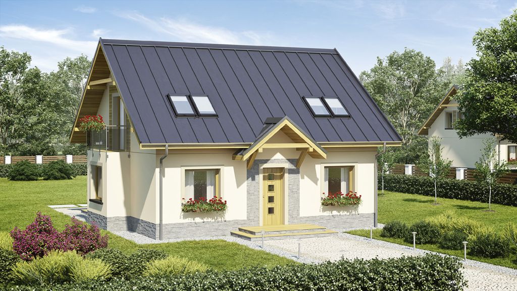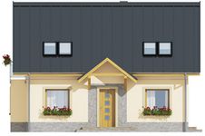 Graficzne opracowanie rzutów poglądowych widocznych na karcie projektu zostało wykonane przez Extradom.pl. Prezentowane przez Extradom.pl wizualizacje wykonane zostały przez autora projektu i należy poczytywać je jedynie za przykład i propozycję wykończenia, wizję architektoniczną autora projektu. Ostateczne wykończenie budynku może nastąpić na wiele sposobów. Szczegółowe rozwiązania zastosowane w oferowanej dokumentacji - w tym również ilość, lokalizacje i wygląd okien, drzwi, kominów - mogą w niewielkim stopniu różnić się od prezentowanej wizualizacji budynku.