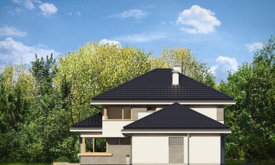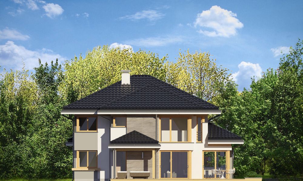 Graficzne opracowanie rzutów poglądowych widocznych na karcie projektu zostało wykonane przez Extradom.pl. Prezentowane przez Extradom.pl wizualizacje wykonane zostały przez autora projektu i należy poczytywać je jedynie za przykład i propozycję wykończenia, wizję architektoniczną autora projektu. Ostateczne wykończenie budynku może nastąpić na wiele sposobów. Szczegółowe rozwiązania zastosowane w oferowanej dokumentacji - w tym również ilość, lokalizacje i wygląd okien, drzwi, kominów - mogą w niewielkim stopniu różnić się od prezentowanej wizualizacji budynku.
