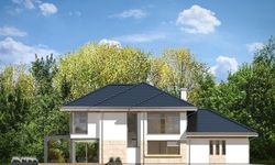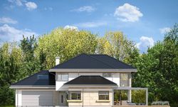 Graficzne opracowanie rzutów poglądowych widocznych na karcie projektu zostało wykonane przez Extradom.pl. Prezentowane przez Extradom.pl wizualizacje wykonane zostały przez autora projektu i należy poczytywać je jedynie za przykład i propozycję wykończenia, wizję architektoniczną autora projektu. Ostateczne wykończenie budynku może nastąpić na wiele sposobów. Szczegółowe rozwiązania zastosowane w oferowanej dokumentacji - w tym również ilość, lokalizacje i wygląd okien, drzwi, kominów - mogą w niewielkim stopniu różnić się od prezentowanej wizualizacji budynku.