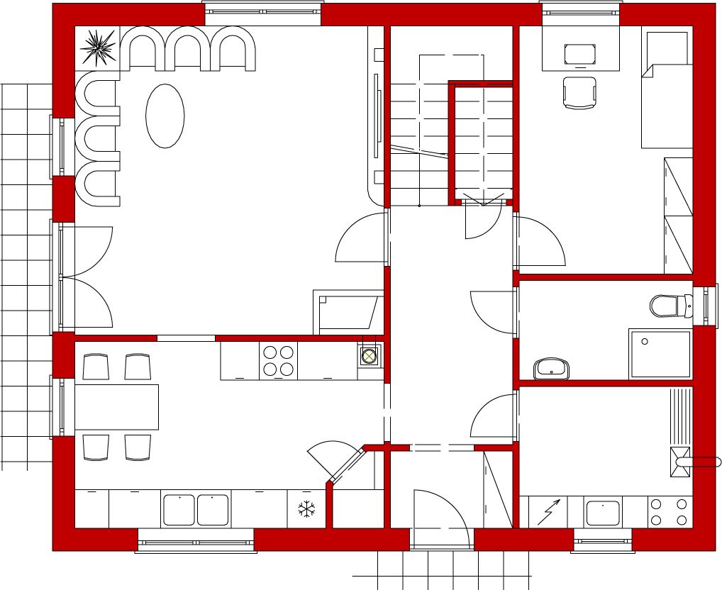 Ściany: szkieletowe z poszyciem OSB-3. Strop: belkowy drewniany. Podłoga na gruncie: wylewka na styropianie. Dach: gonty bitumiczne/dachówka/blacha.