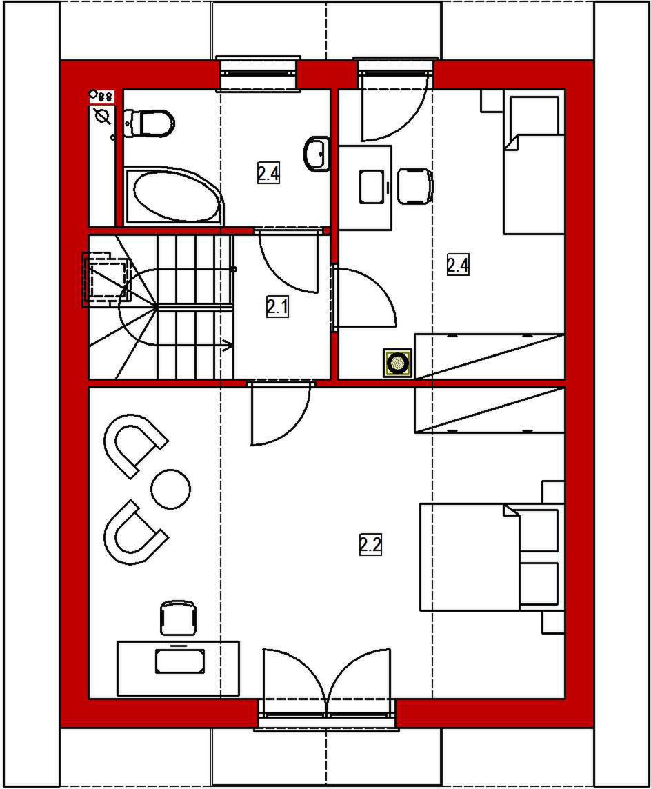 Graficzne opracowanie rzutów poglądowych widocznych na karcie projektu zostało wykonane przez Extradom.pl. Prezentowane przez Extradom.pl wizualizacje wykonane zostały przez autora projektu i należy poczytywać je jedynie za przykład i propozycję wykończenia, wizję architektoniczną autora projektu. Ostateczne wykończenie budynku może nastąpić na wiele sposobów. Szczegółowe rozwiązania zastosowane w oferowanej dokumentacji - w tym również ilość, lokalizacje i wygląd okien, drzwi, kominów - mogą w niewielkim stopniu różnić się od prezentowanej wizualizacji budynku.