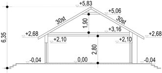 Ściany: szkieletowe 14,5 cm + styropian 031 - 10 cm (U=0,13 W/m2*K). Strop: drewniany belkowy (U=0,13 W/m2*K). Dach: gonty bitumiczne / dachówka / blacha.