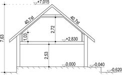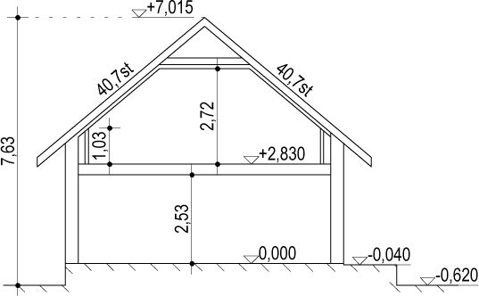 Ściany: szkieletowe 15cm+styropian ryfl. 15cm (U=0,10 W/m2*K). Strop: drewniany belkowy. Dach: gonty bitumiczne / dachówka / blacha (U=0,09 W/m2*K).