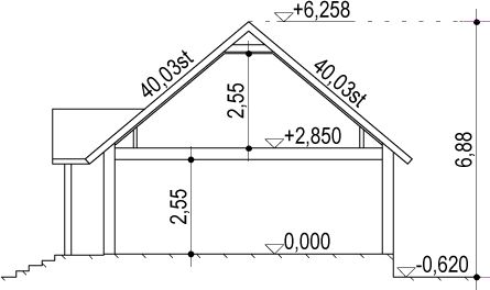 Ściany: szkieletowe 15cm + styropian ryflowany 15cm (U=0,12 W/m2*K). Dach: gonty bitumiczne / dachówka / blacha (U=0,20 W/m2*K). Strop: drewniany belkowy.