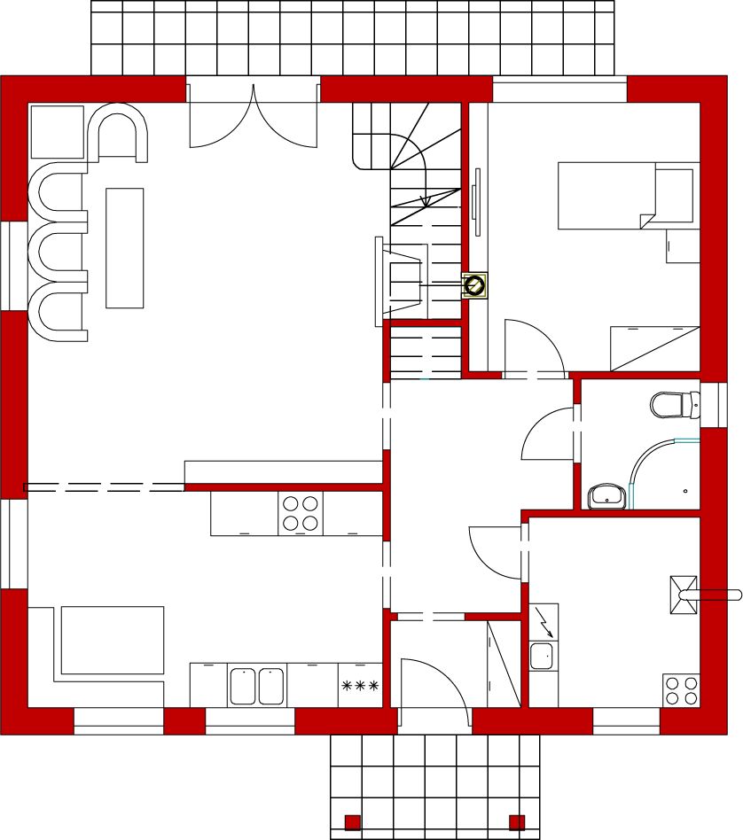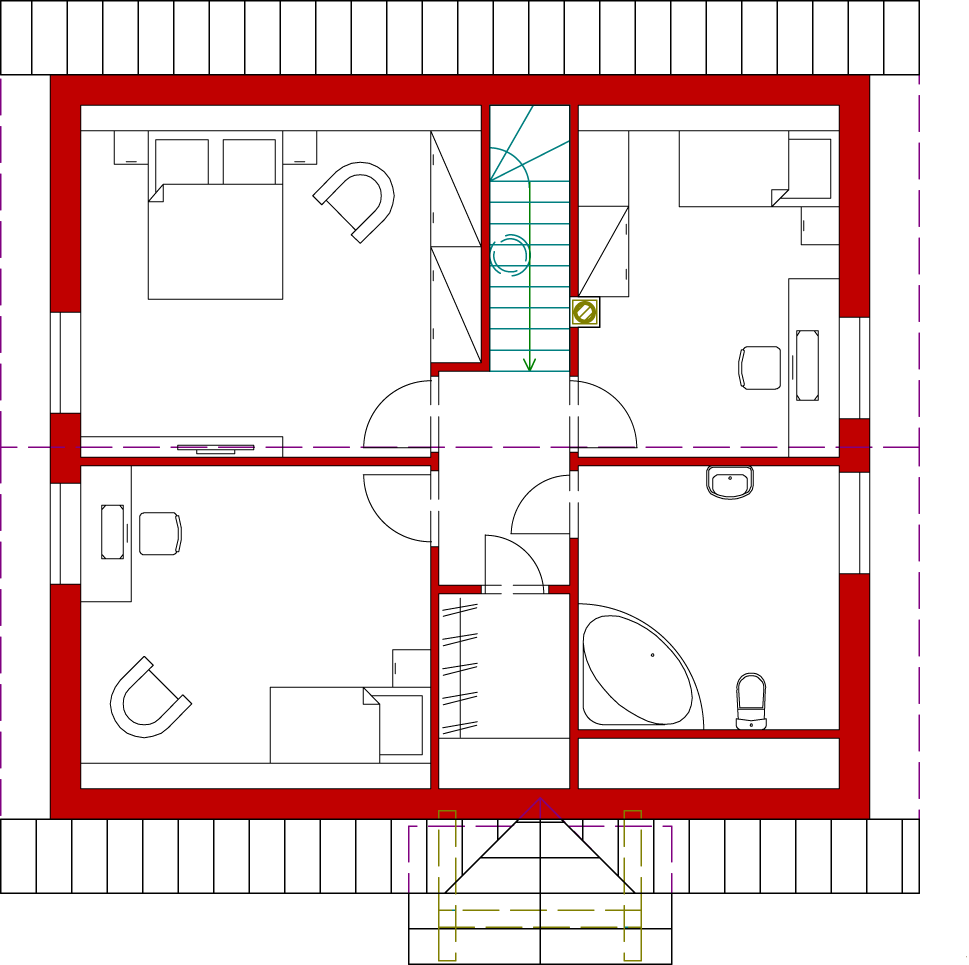 Graficzne opracowanie rzutów poglądowych widocznych na karcie projektu zostało wykonane przez Extradom.pl. Prezentowane przez Extradom.pl wizualizacje wykonane zostały przez autora projektu i należy poczytywać je jedynie za przykład i propozycję wykończenia, wizję architektoniczną autora projektu. Ostateczne wykończenie budynku może nastąpić na wiele sposobów. Szczegółowe rozwiązania zastosowane w oferowanej dokumentacji - w tym również ilość, lokalizacje i wygląd okien, drzwi, kominów - mogą w niewielkim stopniu różnić się od prezentowanej wizualizacji budynku.