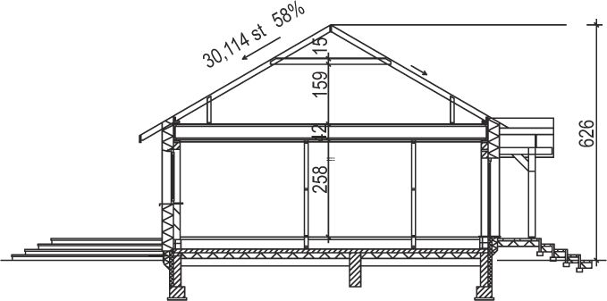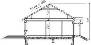 Ławy fundamentowe: 7,0 m3. Ściany fundamentowe: 10,5 m3. Płyta fundamentowa 10cm: 143,3 m2. Podłoga parteru: 123,7 m2. Ściany zewn netto - silikat 180mm: 109,1 m2. Ściany wewn.brutto - karton-gips: 124,1 m2. Elewacja - tynk mineralny, brutto: 189,8 m2. Podbitka dachowa: 35,0 m2. Strop - drewniany (dom i garaż): 142,3 m2. Okna i drzwi balkonowe: 19,9 m2. Stolarka drzwiowa wewn.: 14,4 m2. Konstrukcja dachu - drewno konstr. więźby i stropu: 15,2 m3. Pokrycie dachu - gonty bitumiczne (dachówka): 222,3 m2. Okapy (rynny): 61,1 mb