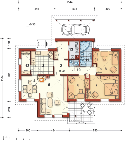 Graficzne opracowanie rzutów poglądowych widocznych na karcie projektu zostało wykonane przez Extradom.pl. Prezentowane przez Extradom.pl wizualizacje wykonane zostały przez autora projektu i należy poczytywać je jedynie za przykład i propozycję wykończenia, wizję architektoniczną autora projektu. Ostateczne wykończenie budynku może nastąpić na wiele sposobów. Szczegółowe rozwiązania zastosowane w oferowanej dokumentacji - w tym również ilość, lokalizacje i wygląd okien, drzwi, kominów - mogą w niewielkim stopniu różnić się od prezentowanej wizualizacji budynku.