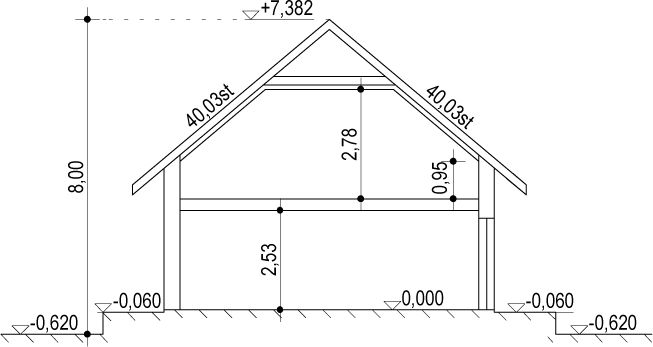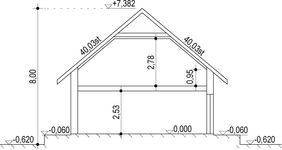 Ściany: szkieletowe 20cm+styropian ryfl.18cm (U=0,09 W/m2*K). Strop: drewniany belkowy. Dach: gonty bitumiczne / dachówka / blacha (U=0,09 W/m2*K).