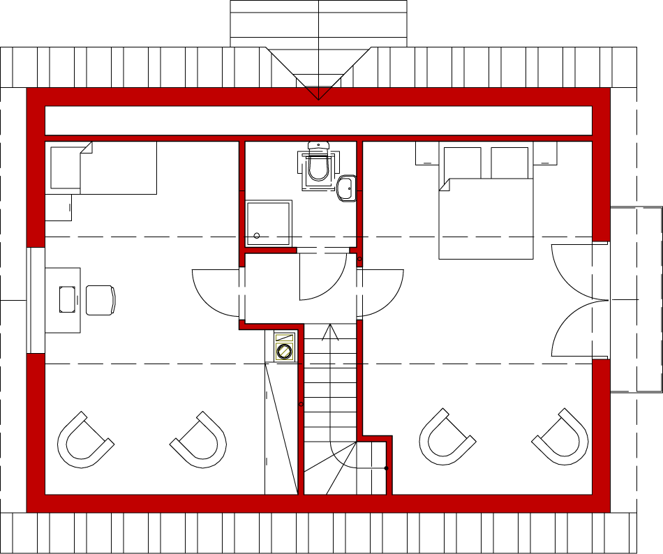 Ściany: szkieletowe 15 cm + styropian ryflowany 15 cm. Dach: gonty bitumiczne/dachówka/blacha. Strop: drewniany belkowy.