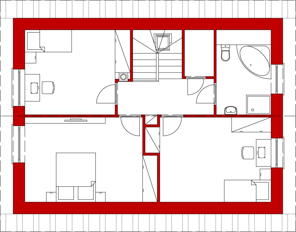 Ściany: silikaty 18cm+styropian 031 - 30cm (U=0,09 W/m2*K). Dach: gonty bitumiczne / dachówka / blacha (U=0,09 W/m2*K). Strop: żelbetowy.