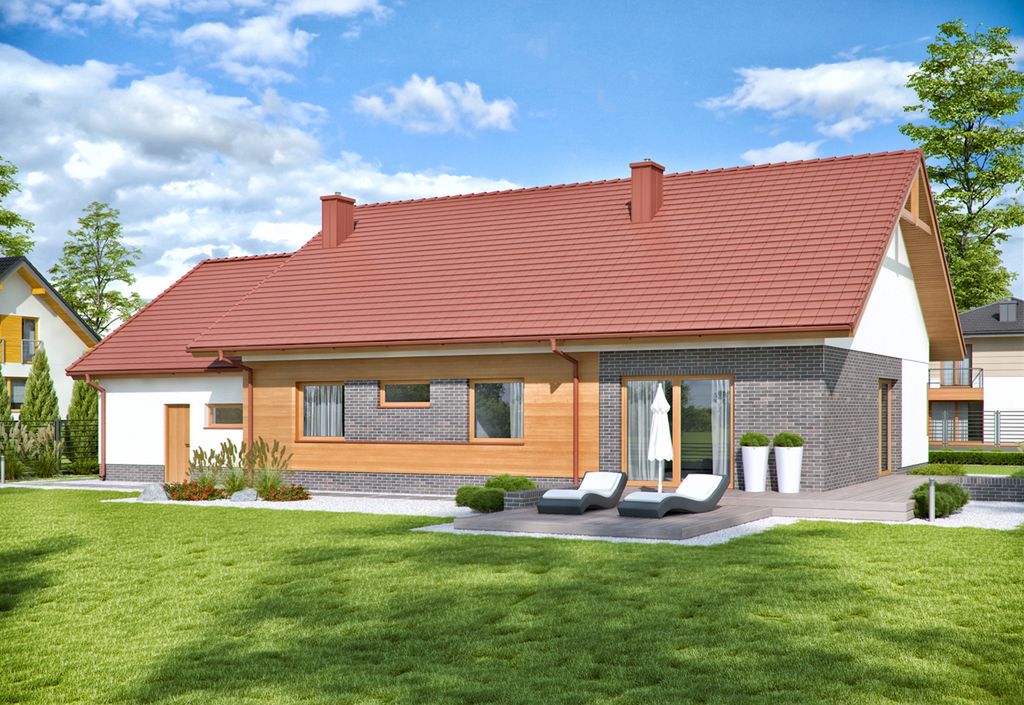 Fundamenty: bezpośrednie, na ławach fundamentowych. Ściany zewnętrzne: bloczki z bet. komórkowego - 24 cm + styropian TERMO ORGANIKA typ Fasada 20 cm. Ściany wewnętrzne: bloczki z bet. komórkowego - 24 cm (działowe - 12 cm). Strop: dolne pasy wiązarów. Elewacje: tynk - System Platinum firmy TERMO ORGANIKA, okładzina klinkierowa oraz deska elewacyjna. Pokrycie dachu: dachówka cementowa. Konstrukcja dachu: prefabrykowane wiązary. Schody wewnętrzne: wyłaz na poddasze. Ogrzewanie: kocioł gazowy kondensacyjny lub kocioł na biomasę/ekogroszek, dodatkowe źródło ciepła - kominek z płaszczem wodnym. Projekt jest zgodny z wymaganiami WT2024, a konstrukcja była obliczana zgodnie z eurokodami.