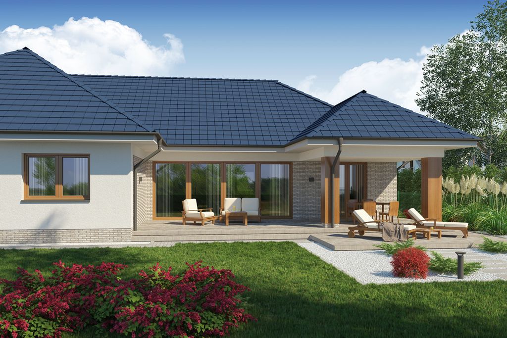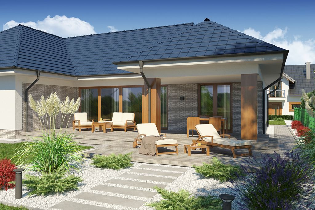 Graficzne opracowanie rzutów poglądowych widocznych na karcie projektu zostało wykonane przez Extradom.pl. Prezentowane przez Extradom.pl wizualizacje wykonane zostały przez autora projektu i należy poczytywać je jedynie za przykład i propozycję wykończenia, wizję architektoniczną autora projektu. Ostateczne wykończenie budynku może nastąpić na wiele sposobów. Szczegółowe rozwiązania zastosowane w oferowanej dokumentacji - w tym również ilość, lokalizacje i wygląd okien, drzwi, kominów - mogą w niewielkim stopniu różnić się od prezentowanej wizualizacji budynku.