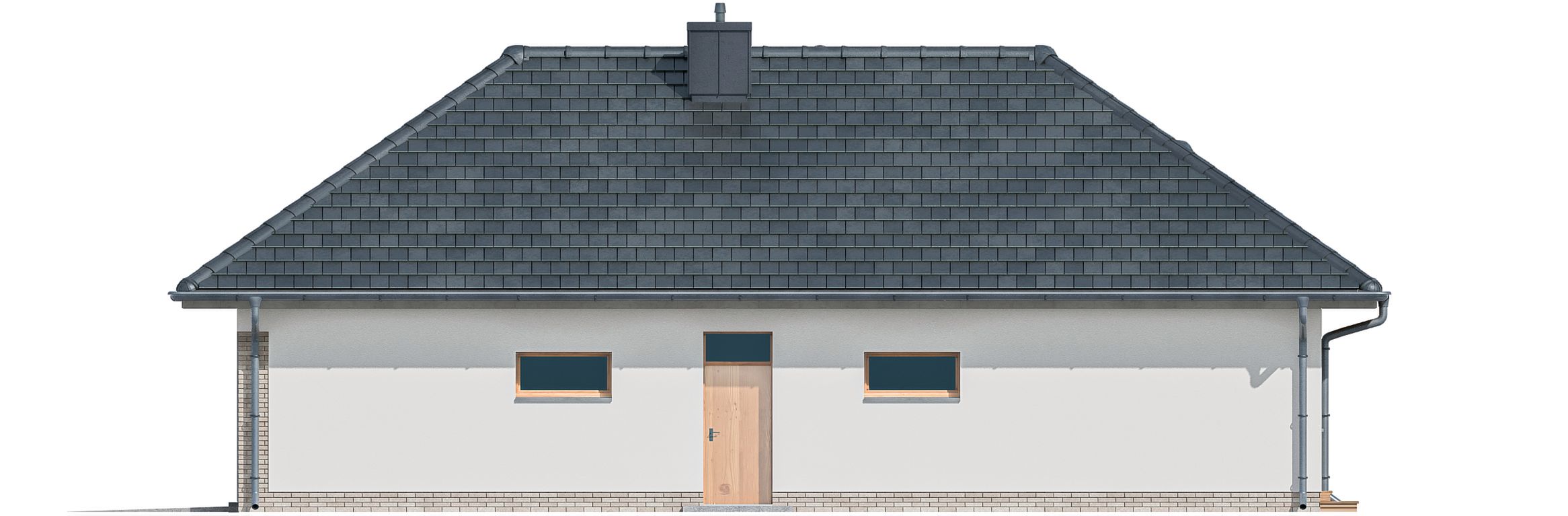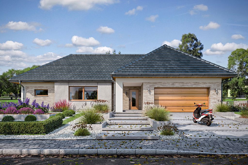 Graficzne opracowanie rzutów poglądowych widocznych na karcie projektu zostało wykonane przez Extradom.pl. Prezentowane przez Extradom.pl wizualizacje wykonane zostały przez autora projektu i należy poczytywać je jedynie za przykład i propozycję wykończenia, wizję architektoniczną autora projektu. Ostateczne wykończenie budynku może nastąpić na wiele sposobów. Szczegółowe rozwiązania zastosowane w oferowanej dokumentacji - w tym również ilość, lokalizacje i wygląd okien, drzwi, kominów - mogą w niewielkim stopniu różnić się od prezentowanej wizualizacji budynku.