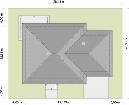 Graficzne opracowanie rzutów poglądowych widocznych na karcie projektu zostało wykonane przez Extradom.pl. Prezentowane przez Extradom.pl wizualizacje wykonane zostały przez autora projektu i należy poczytywać je jedynie za przykład i propozycję wykończenia, wizję architektoniczną autora projektu. Ostateczne wykończenie budynku może nastąpić na wiele sposobów. Szczegółowe rozwiązania zastosowane w oferowanej dokumentacji - w tym również ilość, lokalizacje i wygląd okien, drzwi, kominów - mogą w niewielkim stopniu różnić się od prezentowanej wizualizacji budynku.