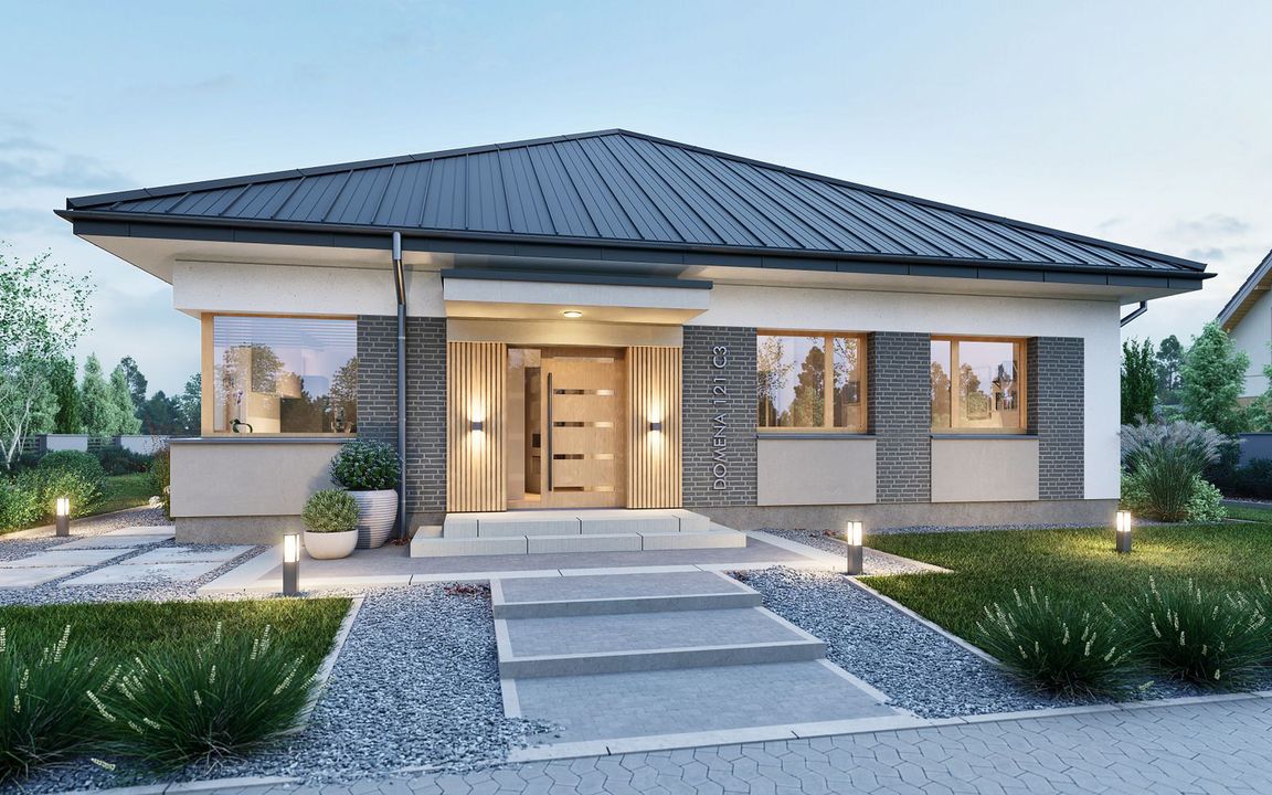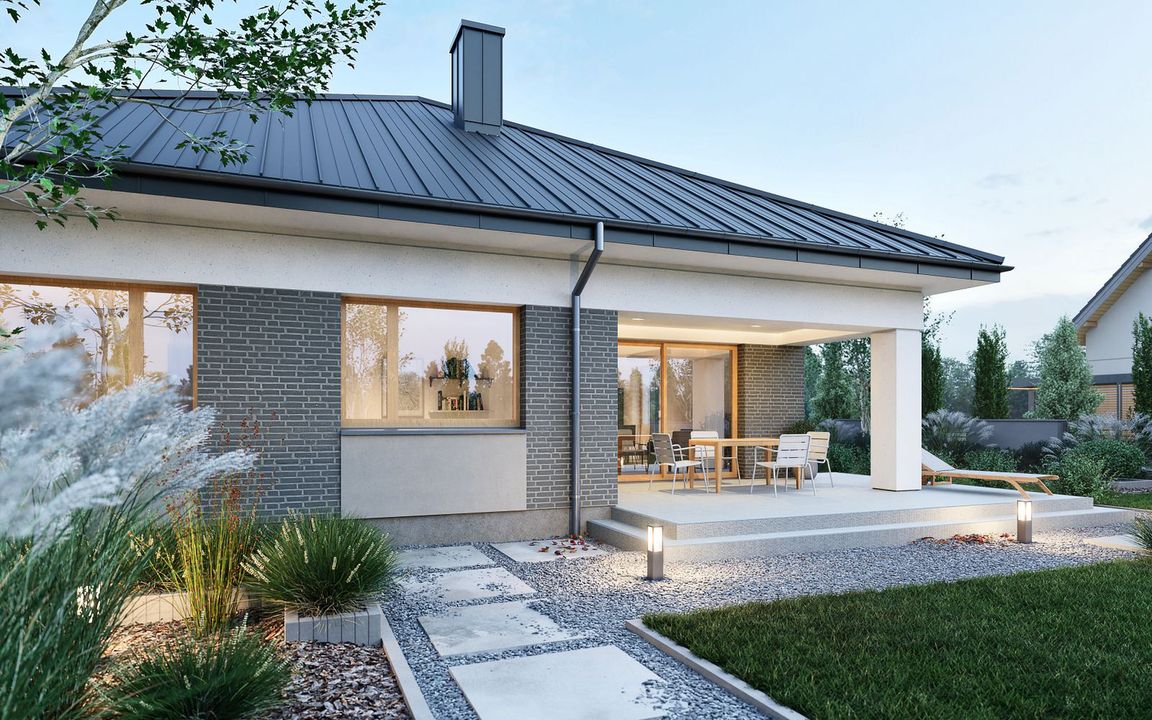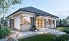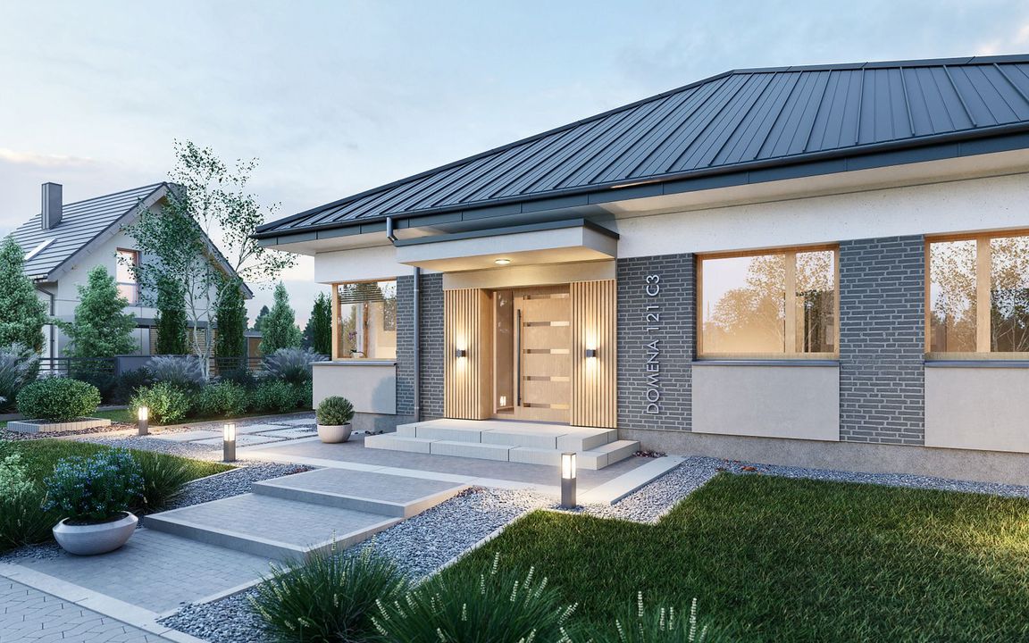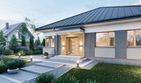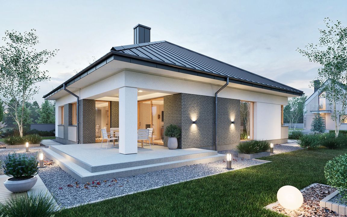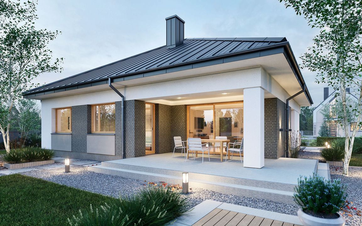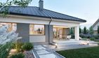Graficzne opracowanie rzutów poglądowych widocznych na karcie projektu zostało wykonane przez Extradom.pl. Prezentowane przez Extradom.pl wizualizacje wykonane zostały przez autora projektu i należy poczytywać je jedynie za przykład i propozycję wykończenia, wizję architektoniczną autora projektu. Ostateczne wykończenie budynku może nastąpić na wiele sposobów. Szczegółowe rozwiązania zastosowane w oferowanej dokumentacji - w tym również ilość, lokalizacje i wygląd okien, drzwi, kominów - mogą w niewielkim stopniu różnić się od prezentowanej wizualizacji budynku.