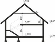 Fundamenty: bezpośrednie, na ławach fundamentowych. Ściany zewnętrzne: cegła silikatowa - 24 cm + styropian TERMO ORGANIKA typ Fasada 20 cm. Ściany wewnętrzne: cegła silikatowa - 24 cm (działowe - 8/12 cm). Strop: gęstożebrowy Teriva E I oraz żelbetowy monolityczny gr. 20 cm (ocieplenie ISOVER Super Mata). Elewacje: tynk - System firmy TERMO ORGANIKA, okładzina z płytek elastycznych. Pokrycie dachu: dachówka cementowa lub blachodachówka. Konstrukcja dachu: tradycyjna drewniana. Schody wewnętrzne: drewniane. Ogrzewanie: kocioł gazowy kondensacyjny lub kocioł na paliwo stałe, dodatkowe źródło ciepła - kominek z płaszczem wodnym. Projekt jest zgodny z wymaganiami WT2024, a konstrukcja była obliczana zgodnie z eurokodami.