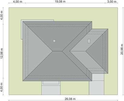 Graficzne opracowanie rzutów poglądowych widocznych na karcie projektu zostało wykonane przez Extradom.pl. Prezentowane przez Extradom.pl wizualizacje wykonane zostały przez autora projektu i należy poczytywać je jedynie za przykład i propozycję wykończenia, wizję architektoniczną autora projektu. Ostateczne wykończenie budynku może nastąpić na wiele sposobów. Szczegółowe rozwiązania zastosowane w oferowanej dokumentacji - w tym również ilość, lokalizacje i wygląd okien, drzwi, kominów - mogą w niewielkim stopniu różnić się od prezentowanej wizualizacji budynku.
