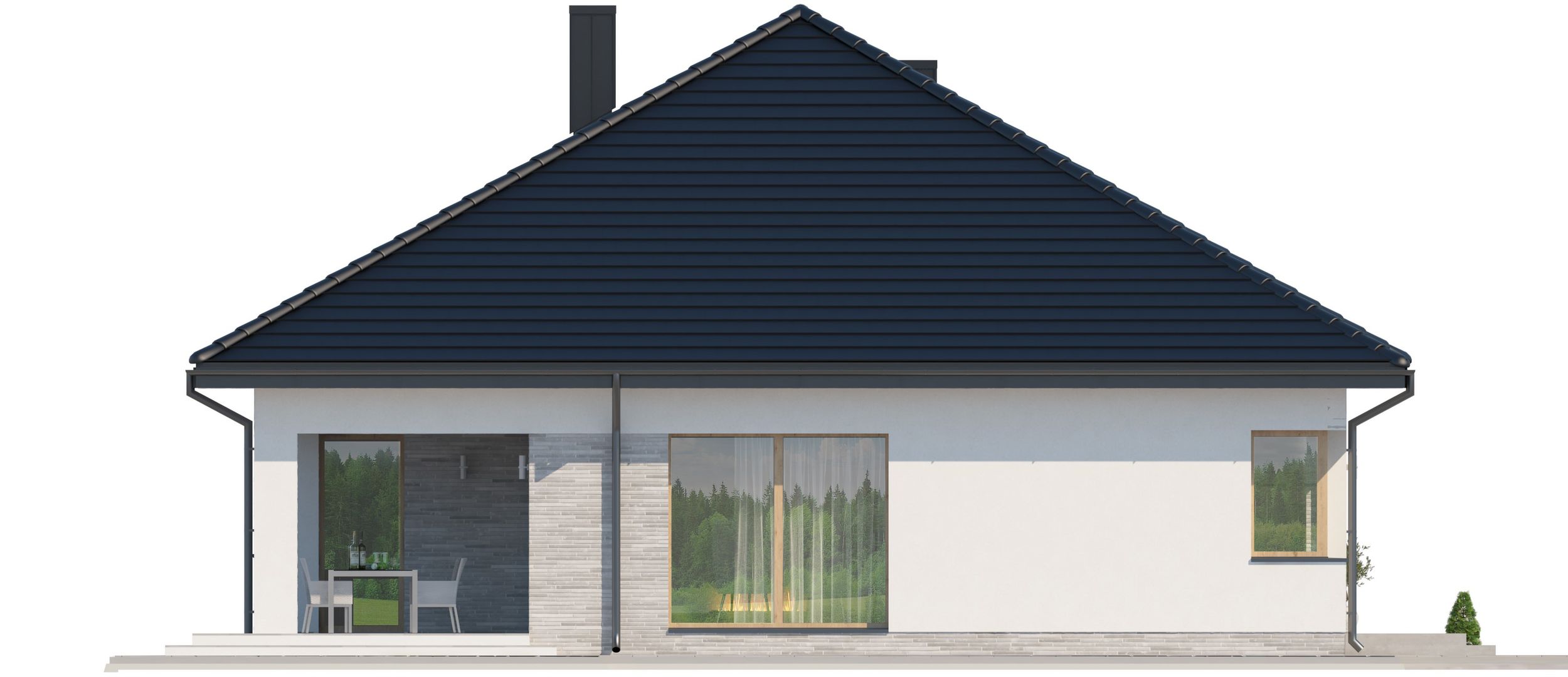 Graficzne opracowanie rzutów poglądowych widocznych na karcie projektu zostało wykonane przez Extradom.pl. Prezentowane przez Extradom.pl wizualizacje wykonane zostały przez autora projektu i należy poczytywać je jedynie za przykład i propozycję wykończenia, wizję architektoniczną autora projektu. Ostateczne wykończenie budynku może nastąpić na wiele sposobów. Szczegółowe rozwiązania zastosowane w oferowanej dokumentacji - w tym również ilość, lokalizacje i wygląd okien, drzwi, kominów - mogą w niewielkim stopniu różnić się od prezentowanej wizualizacji budynku.