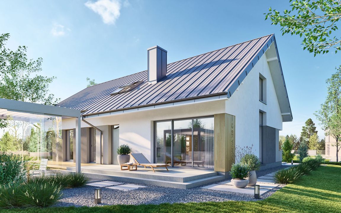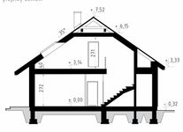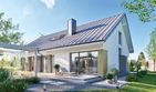Graficzne opracowanie rzutów poglądowych widocznych na karcie projektu zostało wykonane przez Extradom.pl. Prezentowane przez Extradom.pl wizualizacje wykonane zostały przez autora projektu i należy poczytywać je jedynie za przykład i propozycję wykończenia, wizję architektoniczną autora projektu. Ostateczne wykończenie budynku może nastąpić na wiele sposobów. Szczegółowe rozwiązania zastosowane w oferowanej dokumentacji - w tym również ilość, lokalizacje i wygląd okien, drzwi, kominów - mogą w niewielkim stopniu różnić się od prezentowanej wizualizacji budynku.