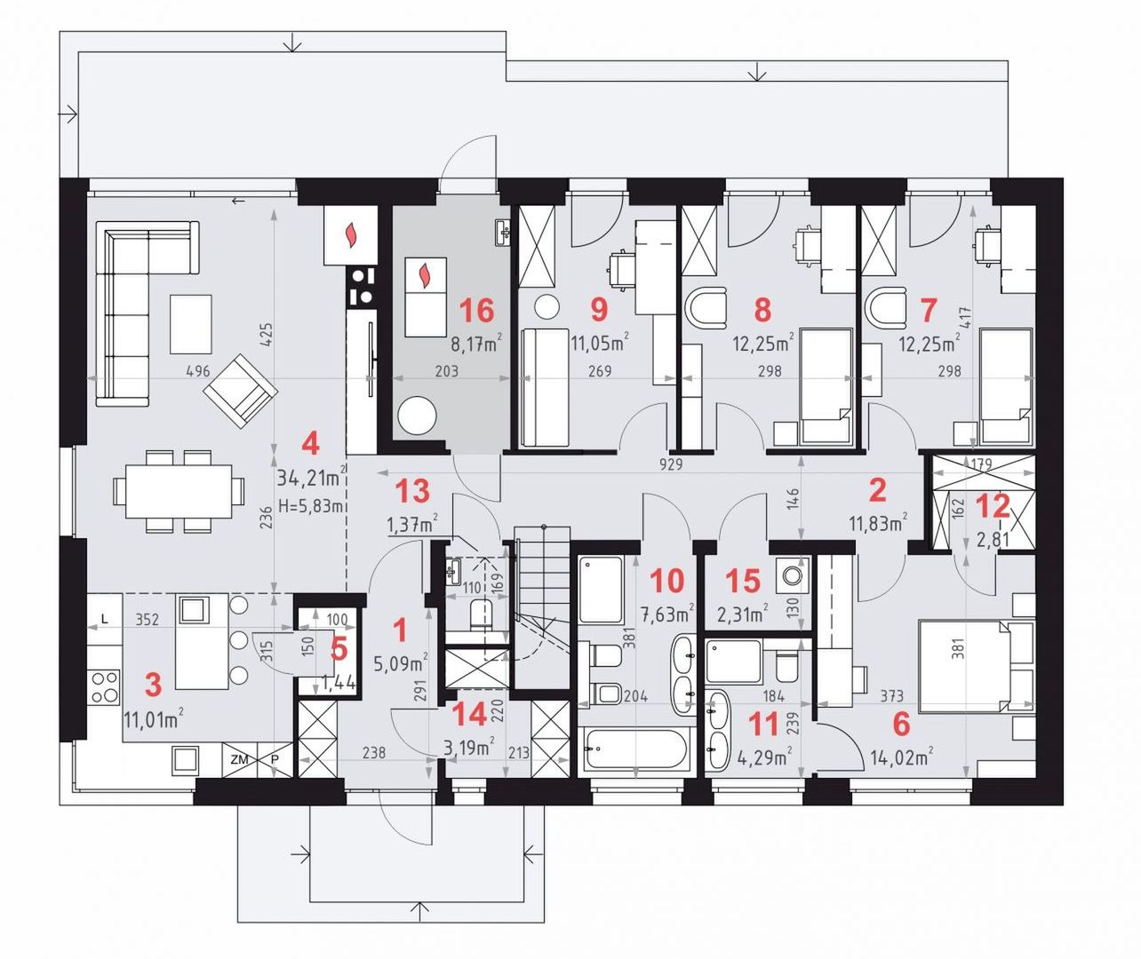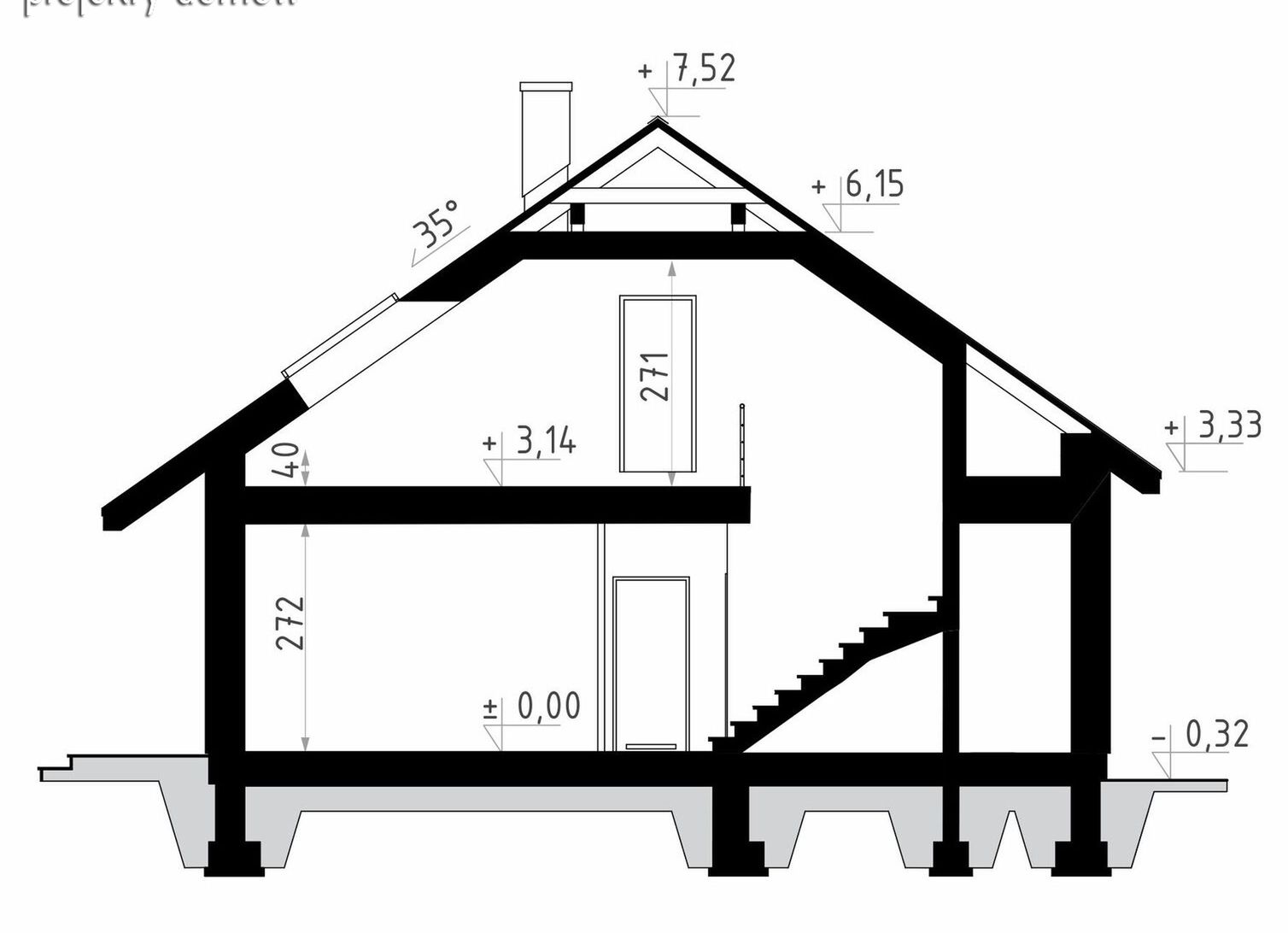 Fundamenty: bezpośrednie, na ławach i stopach fundamentowych. Ściany zewnętrzne: bloczki wapienno-piaskowe - 24 cm + styropian TERMO ORGANIKA typ Fasada 18 -22 cm. Ściany wewnętrzne: bloczki wapienno-piaskowe - 24 cm (działowe – bloczki wapienno-piaskowe - 12/8 cm. Strop: żelbetowy monolityczny. Elewacje: tynk - systemowy firmy TERMO ORGANIKA, lamele elewacyjne. Pokrycie dachu: blacha na rąbek stojący. Konstrukcja dachu: tradycyjna drewniana. Schody wewnętrzne: schody monolityczne. Ogrzewanie: kocioł na paliwo stałe dodatkowe źrodło ciepła - kominek. Projekt jest zgodny z wymaganiami WT2024, a konstrukcja była obliczana zgodnie z eurokodami.