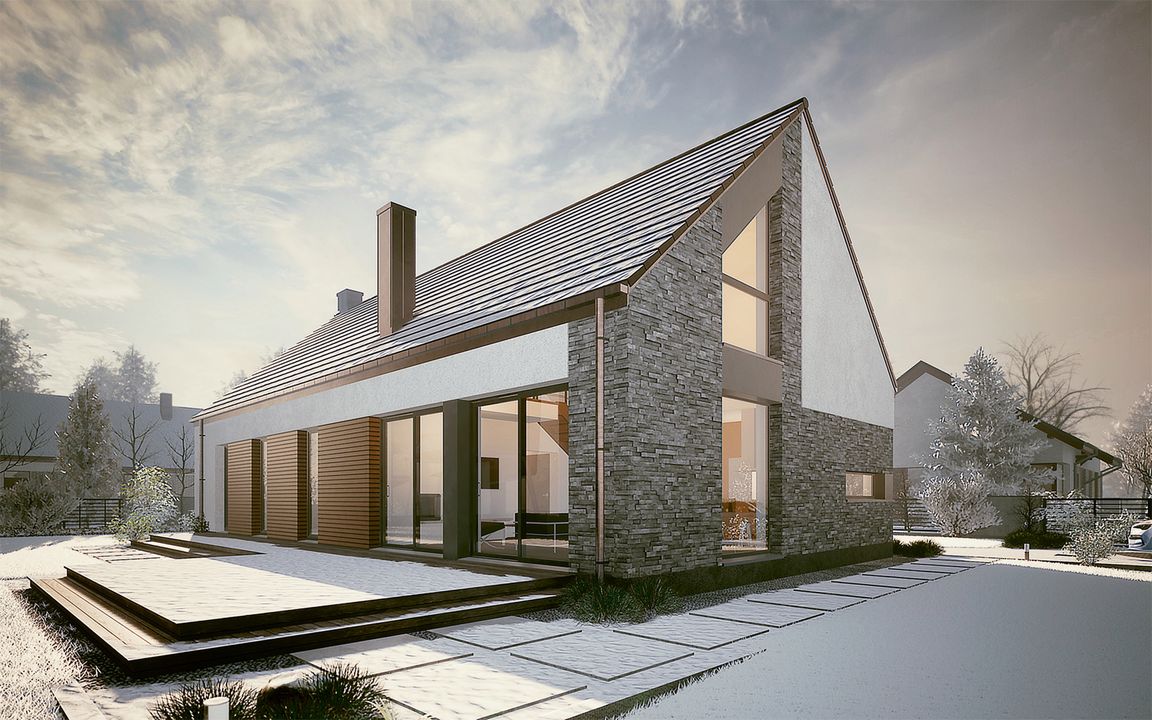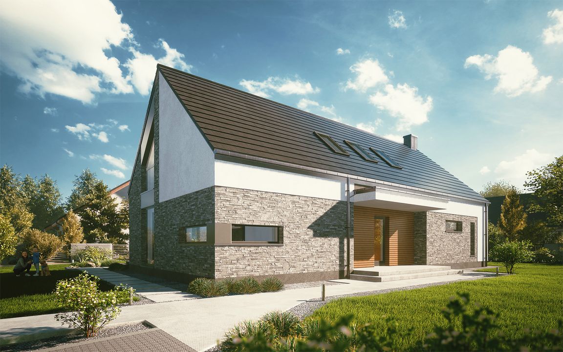 Graficzne opracowanie rzutów poglądowych widocznych na karcie projektu zostało wykonane przez Extradom.pl. Prezentowane przez Extradom.pl wizualizacje wykonane zostały przez autora projektu i należy poczytywać je jedynie za przykład i propozycję wykończenia, wizję architektoniczną autora projektu. Ostateczne wykończenie budynku może nastąpić na wiele sposobów. Szczegółowe rozwiązania zastosowane w oferowanej dokumentacji - w tym również ilość, lokalizacje i wygląd okien, drzwi, kominów - mogą w niewielkim stopniu różnić się od prezentowanej wizualizacji budynku.