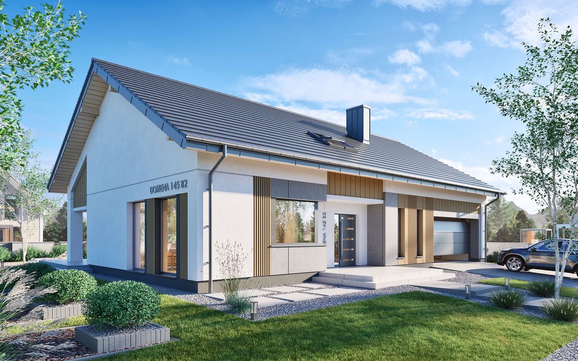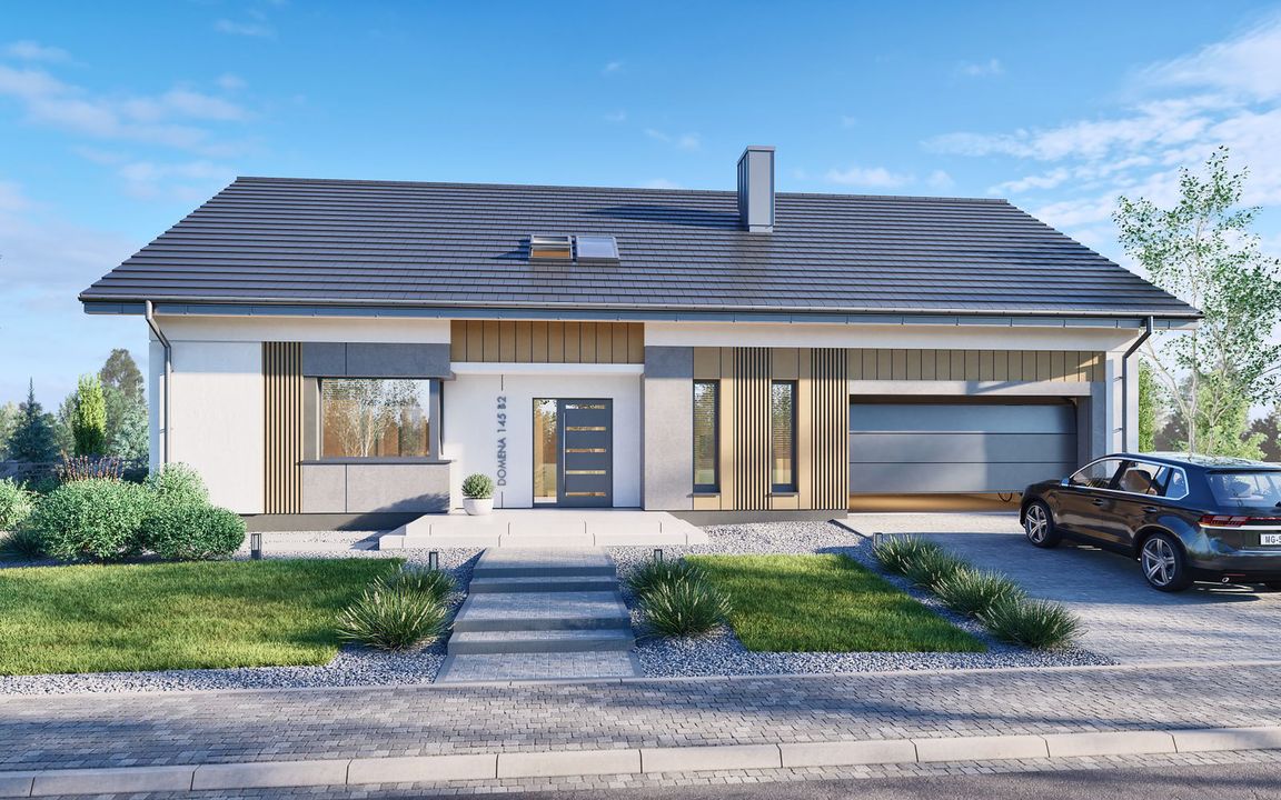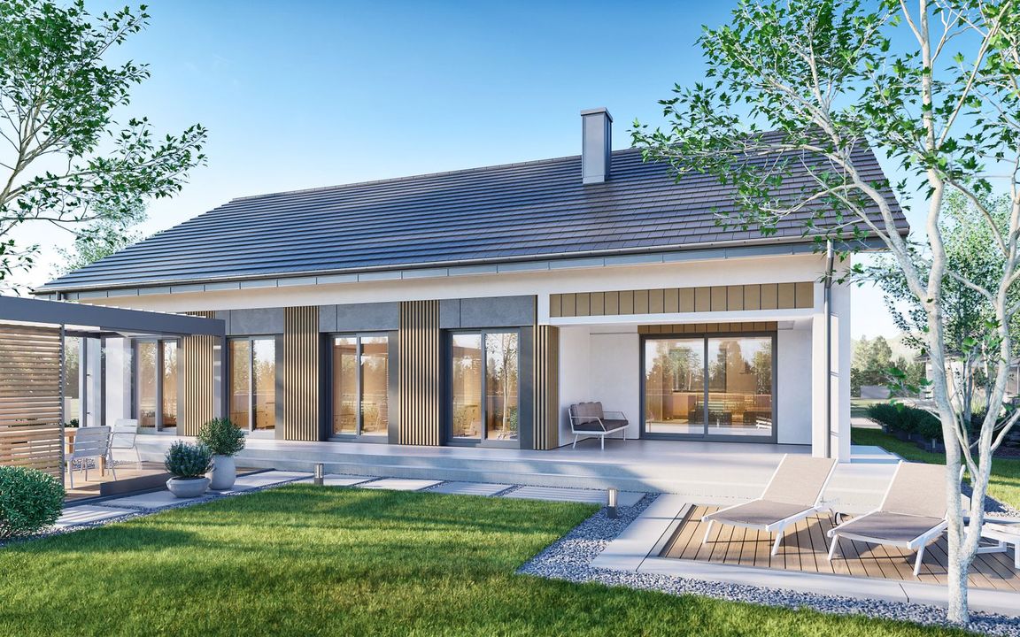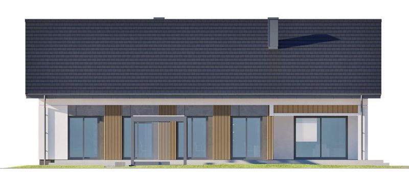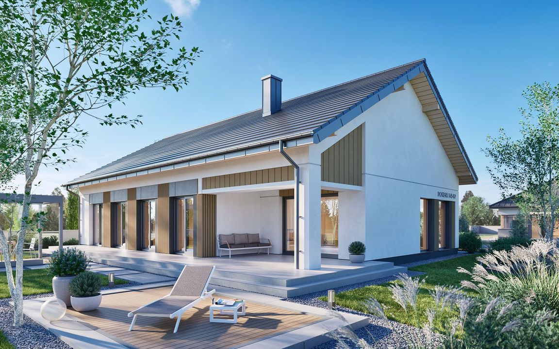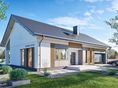 Graficzne opracowanie rzutów poglądowych widocznych na karcie projektu zostało wykonane przez Extradom.pl. Prezentowane przez Extradom.pl wizualizacje wykonane zostały przez autora projektu i należy poczytywać je jedynie za przykład i propozycję wykończenia, wizję architektoniczną autora projektu. Ostateczne wykończenie budynku może nastąpić na wiele sposobów. Szczegółowe rozwiązania zastosowane w oferowanej dokumentacji - w tym również ilość, lokalizacje i wygląd okien, drzwi, kominów - mogą w niewielkim stopniu różnić się od prezentowanej wizualizacji budynku.