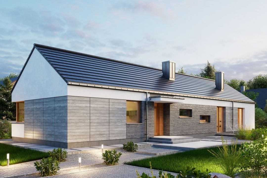 Graficzne opracowanie rzutów poglądowych widocznych na karcie projektu zostało wykonane przez Extradom.pl. Prezentowane przez Extradom.pl wizualizacje wykonane zostały przez autora projektu i należy poczytywać je jedynie za przykład i propozycję wykończenia, wizję architektoniczną autora projektu. Ostateczne wykończenie budynku może nastąpić na wiele sposobów. Szczegółowe rozwiązania zastosowane w oferowanej dokumentacji - w tym również ilość, lokalizacje i wygląd okien, drzwi, kominów - mogą w niewielkim stopniu różnić się od prezentowanej wizualizacji budynku.